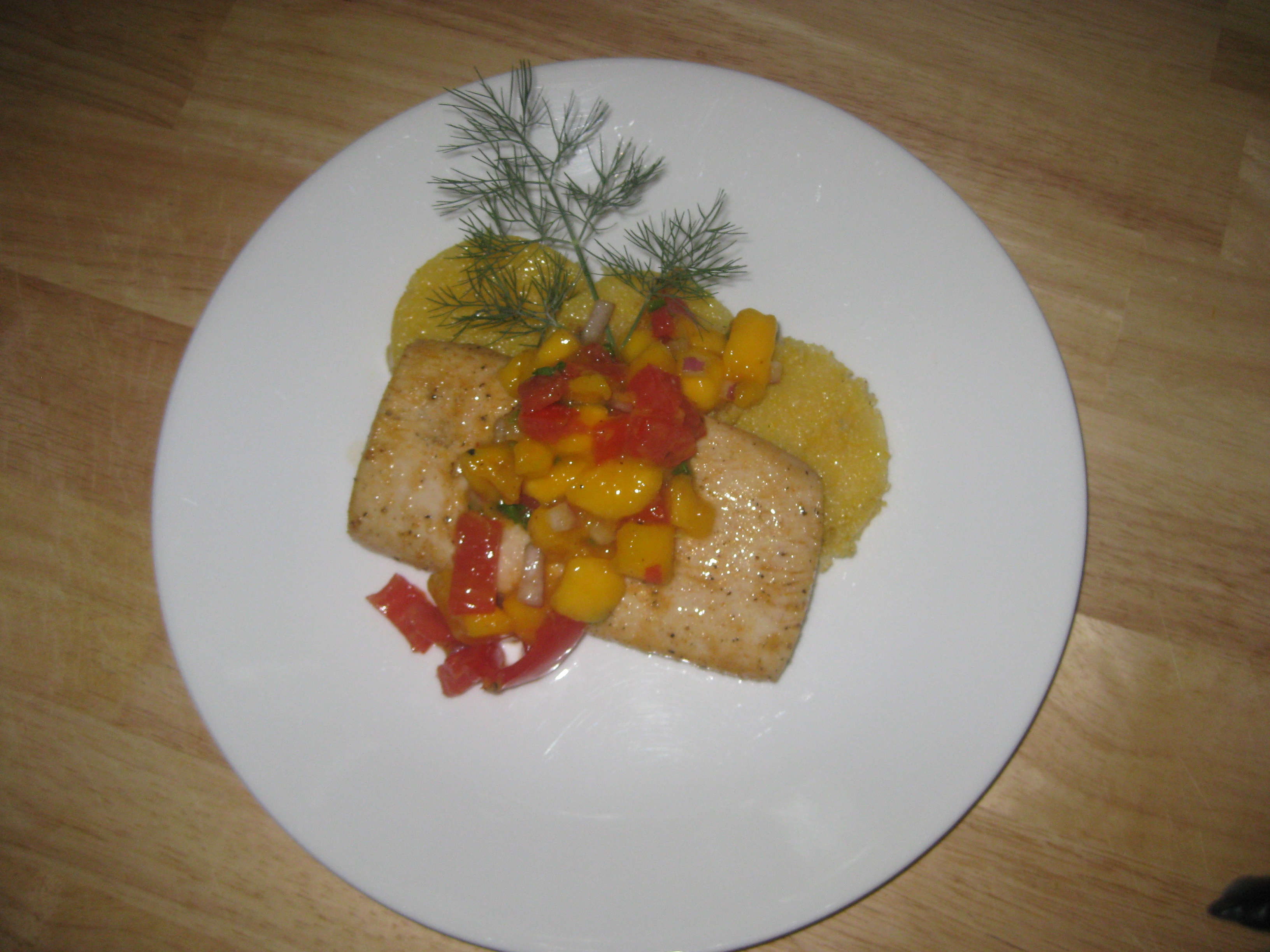 Serve Mahi on top of three discs of polenta and top with Mango salsa. Garnish with fresh dill (FREE from garden)